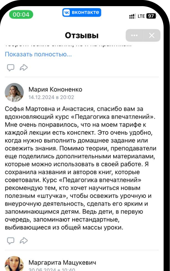 Спасибо вам за вдохновляющий курс «педагогика впечатлений». Мне очень понравилось, что на моём тарифе к каждой лекции есть конспект. Это очень удобно, когда нужно выполнить домашнее задание или освежить знания. Помимо теории, преподаватели поделились дополнительными материалами, которые можно использовать в своей работе. Я сохранила названия и авторов книг, которые советовали. Курс «Педагогика впечатлений» рекомендую тем, кто хочет научиться новым полезным «штучкам», чтобы освежить урочную и внеурочную деятельность, сделать его ярким и запоминающимся детям. Ведь дети, в первую очередь, запоминают нестандартные, выбивающиеся из общей массы уроки.